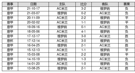 维罗纳 VS AC米兰两队近10年的交战次数为14场,维罗纳3胜4平7负,赢球概率为21.4%,平局概率为28.6%,输球概率为50%。