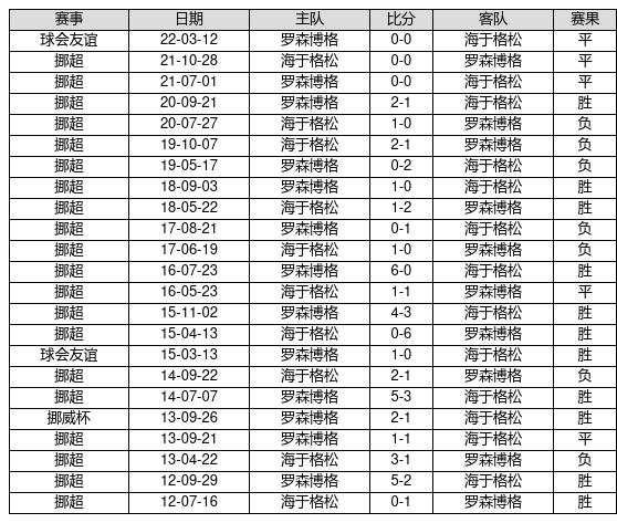 罗森博格 VS 海于格松两队近10年的交战次数为23场,罗森博格11胜5平7负,赢球概率为47.8%,平局概率为21.7%,输球概率为30.4%。