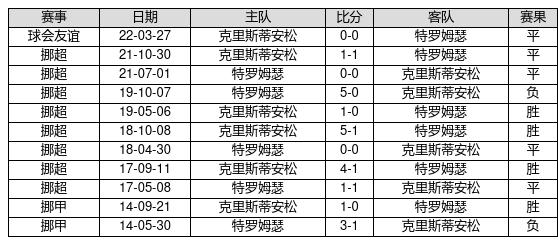 克里斯蒂安松 VS 特罗姆瑟两队近10年的交战次数为11场,克里斯蒂安松4胜5平2负,赢球概率为36.4%,平局概率为45.5%,输球概率为18.2%。