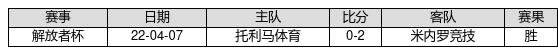 米内罗竞技 VS 托利马体育两队近10年的交战次数为1场,米内罗竞技1胜0平0负,赢球概率为100%,平局概率为0%,输球概率为0%。