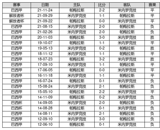 帕梅拉斯 VS 米内罗竞技两队近10年的交战次数为22场,帕梅拉斯3胜9平10负,赢球概率为13.6%,平局概率为40.9%,输球概率为45.5%。