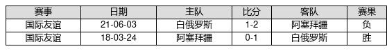 白俄罗斯 VS 阿塞拜疆两队近10年的交战次数为2场,白俄罗斯1胜0平1负,赢球概率为50%,平局概率为0%,输球概率为50%。