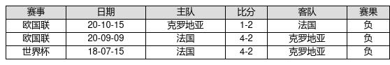 克罗地亚 VS 法国两队近10年的交战次数为3场,克罗地亚0胜0平3负,赢球概率为0%,平局概率为0%,输球概率为100%。