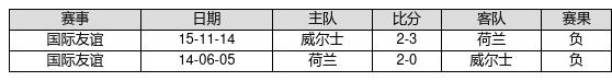 威尔士 VS 荷兰两队近10年的交战次数为2场,威尔士0胜0平2负,赢球概率为0%,平局概率为0%,输球概率为100%。