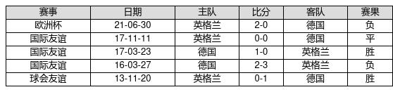 德国 VS 英格兰两队近10年的交战次数为5场,德国2胜1平2负,赢球概率为40%,平局概率为20%,输球概率为40%。