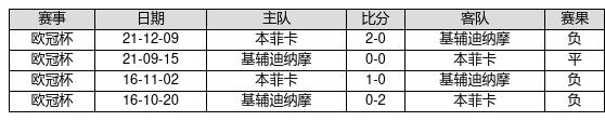 基辅迪纳摩 VS 本菲卡两队近10年的交战次数为4场,基辅迪纳摩0胜1平3负,赢球概率为0%,平局概率为25%,输球概率为75%。