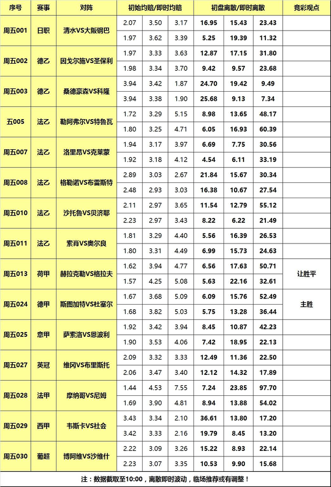 [关于离散] 是竞技彩票特有分析指数,指数基于百家欧赔即时赔率分歧度。基本原理是:百家欧赔平均值与每家赔率差值的绝对值的求和。离散度小则赔率公司观点接近,进而 彩果易打出,离散度大则反之意见分歧大,彩果不易打出。又因**操盘/变赔影响,离散低则概率高理论并非放之四海而皆准,需结合盘赔和基本面等信息综合运 用。简言之,离散是参考指标,而非填单依据!以下是各场数据汇总(数据截取至10:00):