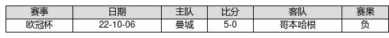 哥本哈根 VS 曼城两队近10年的交战次数为1场,哥本哈根0胜0平1负,赢球概率为0%,平局概率为0%,输球概率为100%。