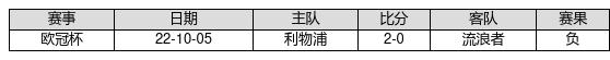 流浪者 VS 利物浦两队近10年的交战次数为1场,流浪者0胜0平1负,赢球概率为0%,平局概率为0%,输球概率为100%。
