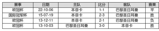 巴黎圣日耳曼 VS 本菲卡两队近10年的交战次数为4场,巴黎圣日耳曼2胜1平1负,赢球概率为50%,平局概率为25%,输球概率为25%。