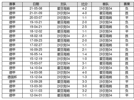 沙尔克04 VS 霍芬海姆两队近10年的交战次数为20场,沙尔克047胜5平8负,赢球概率为35%,平局概率为25%,输球概率为40%。