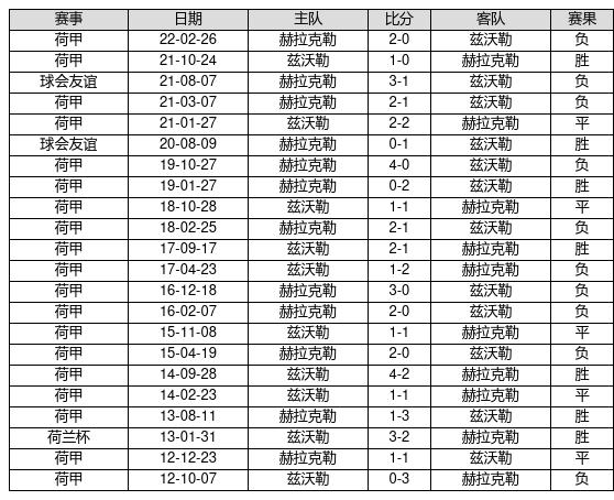 兹沃勒 VS 赫拉克勒两队近10年的交战次数为22场,兹沃勒7胜5平10负,赢球概率为31.8%,平局概率为22.7%,输球概率为45.5%。