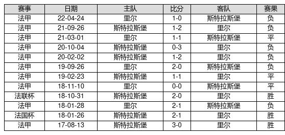 斯特拉斯堡 VS 里尔两队近10年的交战次数为12场,斯特拉斯堡3胜3平6负,赢球概率为25%,平局概率为25%,输球概率为50%。