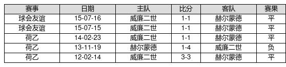 赫尔蒙德 VS 威廉二世两队近10年的交战次数为5场,赫尔蒙德0胜4平1负,赢球概率为0%,平局概率为80%,输球概率为20%。