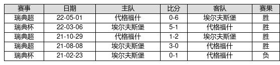 埃尔夫斯堡 VS 代格福什两队近10年的交战次数为5场,埃尔夫斯堡4胜0平1负,赢球概率为80%,平局概率为0%,输球概率为20%。