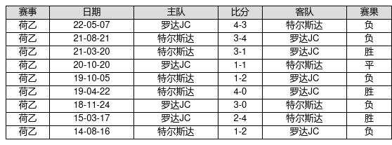 特尔斯达 VS 罗达JC两队近10年的交战次数为9场,特尔斯达3胜1平5负,赢球概率为33.3%,平局概率为11.1%,输球概率为55.6%。