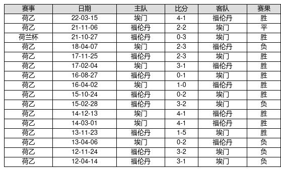 埃门 VS 福伦丹两队近10年的交战次数为16场,埃门10胜1平5负,赢球概率为62.5%,平局概率为6.3%,输球概率为31.3%。