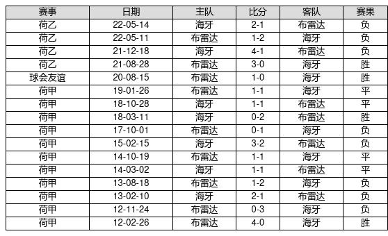 布雷达 VS 海牙两队近10年的交战次数为16场,布雷达4胜4平8负,赢球概率为25%,平局概率为25%,输球概率为50%。