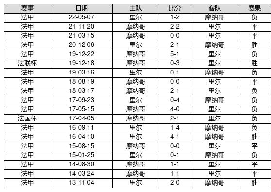 里尔 VS 摩纳哥两队近10年的交战次数为19场,里尔4胜6平9负,赢球概率为21.1%,平局概率为31.6%,输球概率为47.4%。