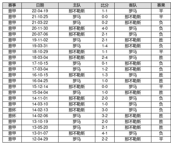 罗马 VS 那不勒斯两队近10年的交战次数为23场,罗马8胜5平10负,赢球概率为34.8%,平局概率为21.7%,输球概率为43.5%。