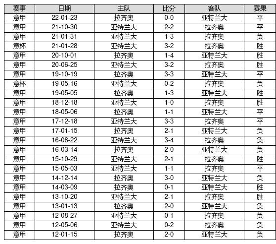 亚特兰大 VS 拉齐奥两队近10年的交战次数为24场,亚特兰大8胜6平10负,赢球概率为33.3%,平局概率为25%,输球概率为41.7%。