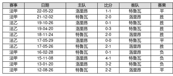 特鲁瓦 VS 洛里昂两队近10年的交战次数为11场,特鲁瓦5胜3平3负,赢球概率为45.5%,平局概率为27.3%,输球概率为27.3%。