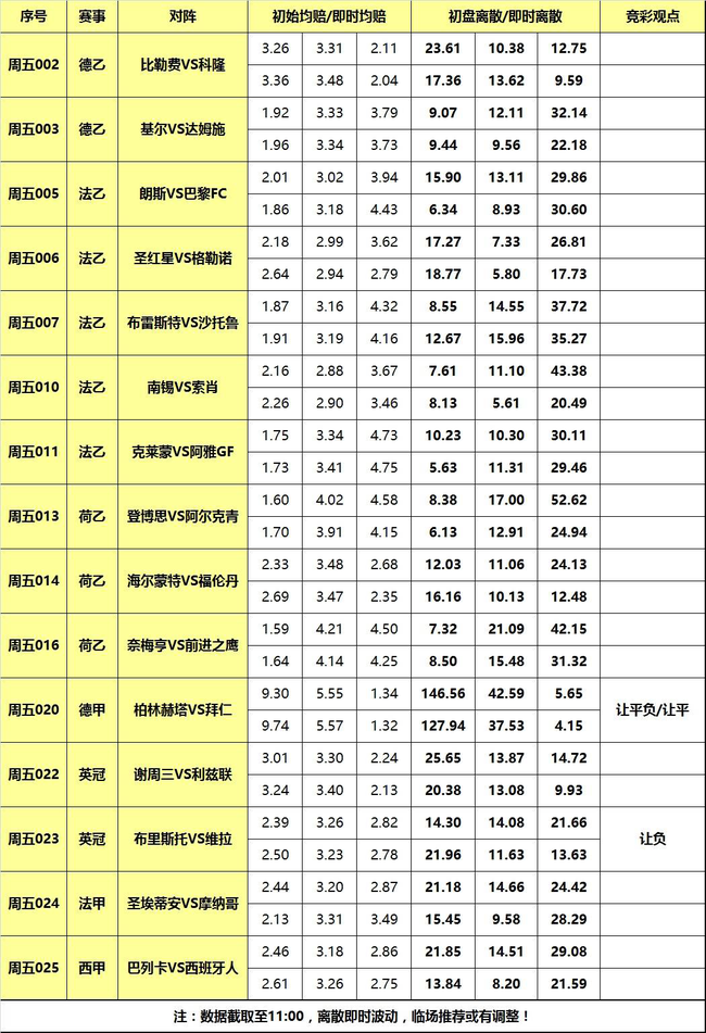 周五回归传统联赛模式,今晚法乙和荷乙开启新一轮征程,另外一周双赛的五大联赛继续开快车,周中遭遇冷门的拜仁和摩纳哥继续出战,另外英冠联赛今晚先赛两场。周五赛程共计31场,早间档精选分享欧洲联赛15场指数,另附德甲和英冠2场早场解读!晚间临场2档更新,另附竞彩/指数观点,主推3场和2单串关,欢迎天天盈球搜索关注“竞足离散”专家号获取!
