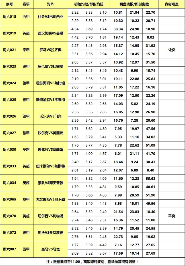 [关于离散] 是竞技彩票特有分析指数,指数基于百家欧赔即时赔率分歧度。基本原理是:百家欧赔平均值与每家赔率差值的绝对值的求和。离散度小则赔率公司观点接近,进而 彩果易打出,离散度大则反之意见分歧大,彩果不易打出。又因**操盘/变赔影响,离散低则概率高理论并非放之四海而皆准,需结合盘赔和基本面等信息综合运 用。简言之,离散是参考指标,而非填单依据!以下是各场数据汇总(数据截取至11:00):