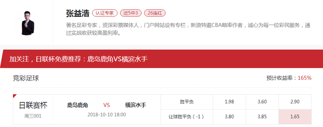 张益浩日联杯推荐:鹿岛鹿角vs横滨水手
