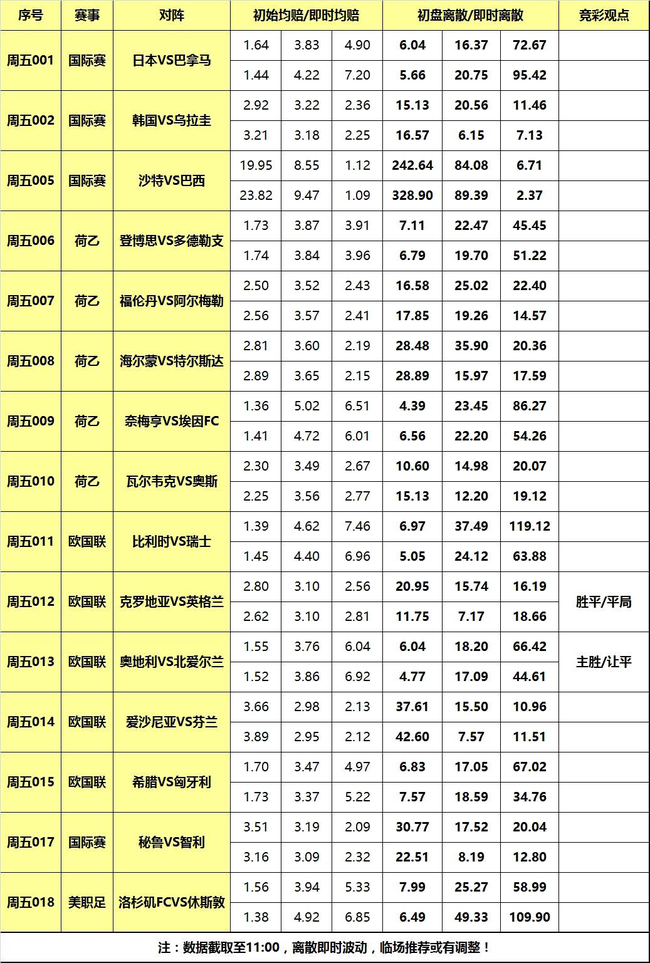周五FIFA赛事继续,傍晚亚洲区日本和韩国分别主场出战,晚间巴西客战沙特,凌晨欧洲国家联赛继续进行,英格兰、比利时和克罗地亚接连出战;另外荷乙联赛不受FIFA影响,今晚将率先进行6场争夺,周六早间美洲区美职和国际热身赛零星早场。周五赛程共计18场,早间档精选分享15场即时离散,另附欧洲国家联赛2场早场解读!周五临场3档推送,早间档分享日本和韩国FIFA赛事指数和方案;晚间分享欧洲国家队赛事9场临场指数和方案,深夜分享美洲地区赛事临场指数和方案,欢迎天天盈球专家列表区搜索关注“竞足离散”专家号获取!