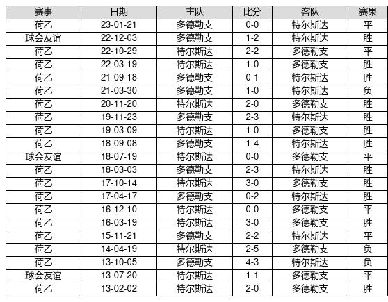 特尔斯达 VS 多德勒支两队近10年的交战次数为21场,特尔斯达12胜6平3负,赢球概率为57.1%,平局概率为28.6%,输球概率为14.3%。