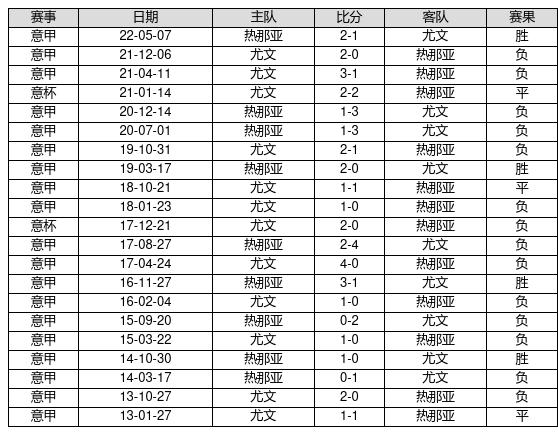 热那亚 VS 尤文两队近10年的交战次数为21场,热那亚4胜3平14负,赢球概率为19%,平局概率为14.3%,输球概率为66.7%。