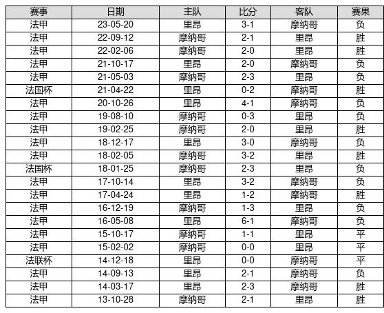 摩纳哥 VS 里昂两队近10年的交战次数为22场,摩纳哥8胜3平11负,赢球概率为36.4%,平局概率为13.6%,输球概率为50%。