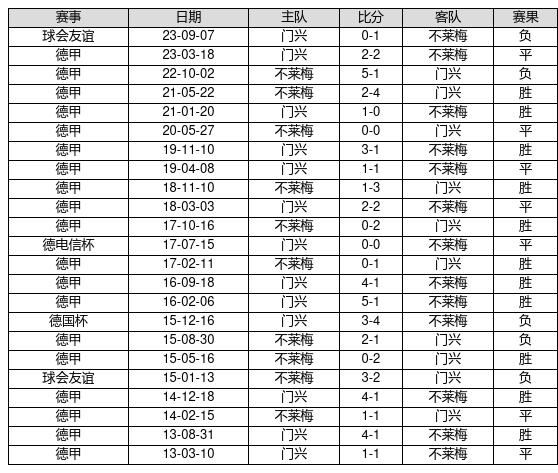 门兴 VS 不莱梅两队近10年的交战次数为23场,门兴11胜7平5负,赢球概率为47.8%,平局概率为30.4%,输球概率为21.7%。