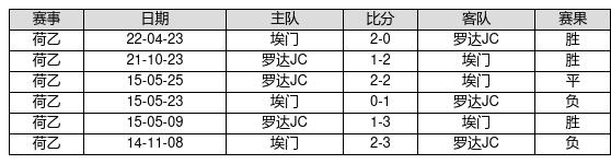 埃门 VS 罗达JC两队近10年的交战次数为6场,埃门3胜1平2负,赢球概率为50%,平局概率为16.7%,输球概率为33.3%。