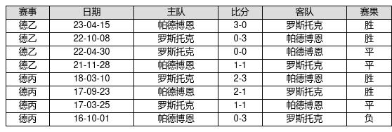 帕德博恩 VS 罗斯托克两队近10年的交战次数为8场,帕德博恩4胜3平1负,赢球概率为50%,平局概率为37.5%,输球概率为12.5%。