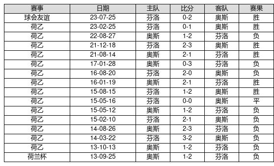 奥斯 VS 芬洛两队近10年的交战次数为16场,奥斯6胜1平9负,赢球概率为37.5%,平局概率为6.3%,输球概率为56.3%。