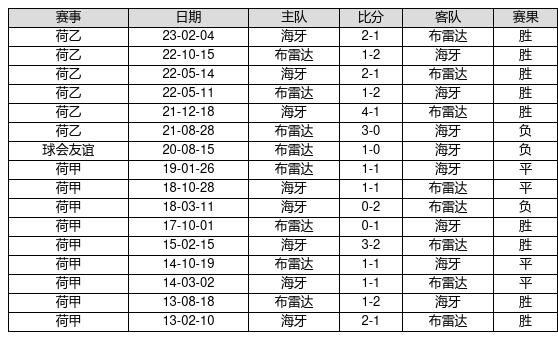 海牙 VS 布雷达两队近10年的交战次数为16场,海牙9胜4平3负,赢球概率为56.3%,平局概率为25%,输球概率为18.8%。