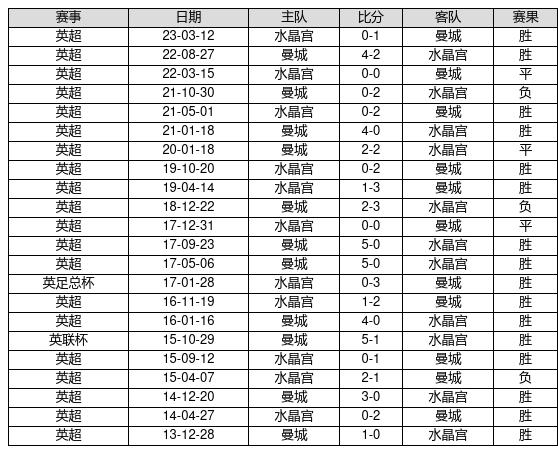 曼城 VS 水晶宫两队近10年的交战次数为22场,曼城16胜3平3负,赢球概率为72.7%,平局概率为13.6%,输球概率为13.6%。