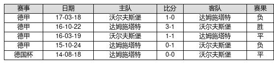 达姆施塔特 VS 沃尔夫斯堡两队近10年的交战次数为5场,达姆施塔特1胜2平2负,赢球概率为20%,平局概率为40%,输球概率为40%。