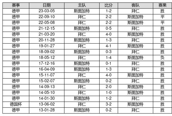 拜仁 VS 斯图加特两队近10年的交战次数为18场,拜仁15胜2平1负,赢球概率为83.3%,平局概率为11.1%,输球概率为5.6%。
