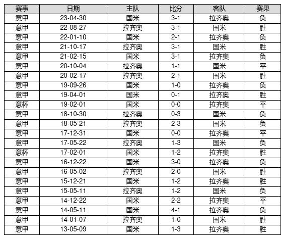 拉齐奥 VS 国米两队近10年的交战次数为23场,拉齐奥9胜4平10负,赢球概率为39.1%,平局概率为17.4%,输球概率为43.5%。