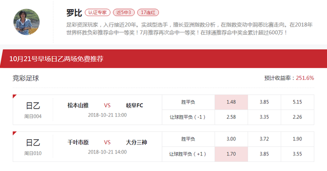 昨天早场全黑,晚场成绩4中3还可以,可惜阿贾克斯最后发力,不然有机会命中一组四串一的。今天继续发免费推荐。希望大家收看免费推荐的时候,电关注罗比的专栏,关注一下罗比的胜负彩推荐。谢谢各位!