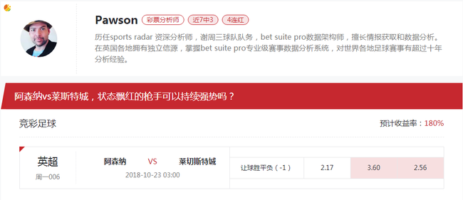 而今天的赔率数据,显得不那么乐观。亚盘主流公司现在都是阿森纳-1球盘口,而欧赔威廉希尔、bet 365等都不约而同上调主胜,阿森纳在大好状态下,却得不到数据支持,让人费解。而bsp系统提示,本场bet 365亚盘初盘-1,而欧赔初赔与威廉希尔使用相同的1.5 4.5 6体系,历史上出现这样的状态主队收获4胜1平2负,看上去还是占优,但4场胜利全部是以1球小胜!