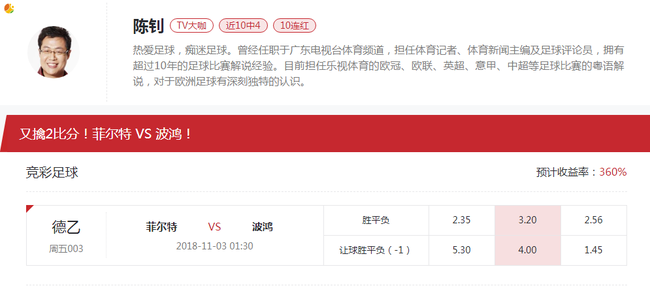 [新浪球通]陈钊竞彩推荐:菲尔特vs波鸿
