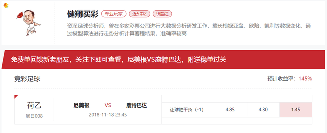 串关推荐:008尼美根VS鹿特巴达:让球客胜(1.48),014西班牙VS波黑:主胜(1.12)
