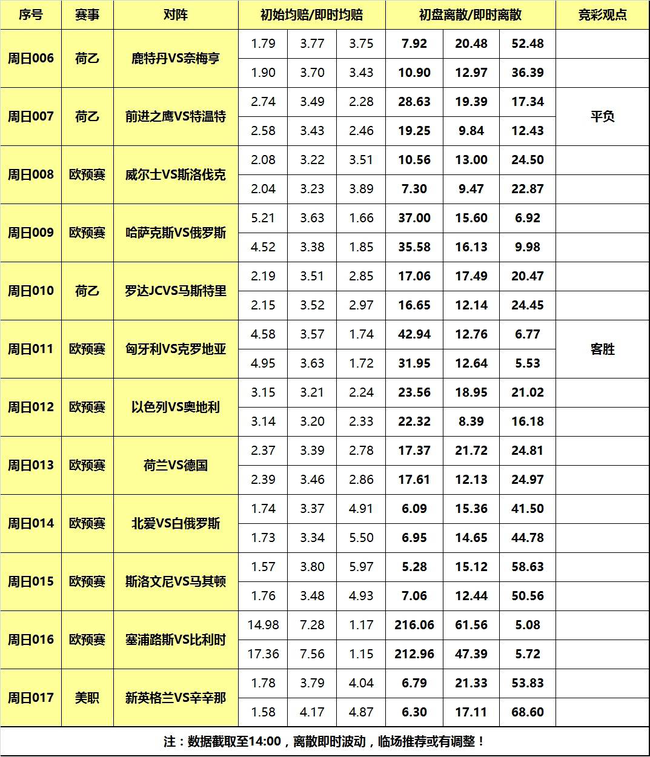 [关于离散] 竞技体育分析指数,也就是各家欧指分歧度。基本原理:百家欧指平均值与每家指数差值的绝对值的求和。离散度小则各家观点接近,进而赛果易打出;离散度大反之意见分歧大,赛果不易打出。又因各方因素影响下指数变动,离散在特殊时刻具有更高参考价值,切勿盲目参考运用。换句话说,离散只是参考指数,而非结论性数据!以下是各场数据汇总(数据截取至14:00):