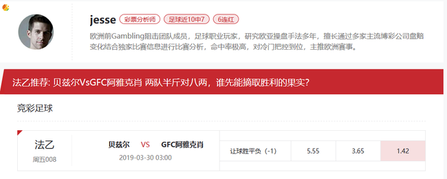 贝兹尔VsGFC阿雅克肖 主队贝兹尔本赛季法乙联赛29场6胜8平15负暂列排名第19,属联赛下游水平的球队。球队近期攻防两端表现不尽人意,近十场各项赛事1胜5平4负,战绩不佳,有待提高。 客队GFC阿雅克肖本赛季法乙联赛29场8胜9平12负暂列排名第15,属联赛下游水平的球队。球队近期攻防两端表现不够突出,近十场各项赛事2胜5平3负,战绩一般。本赛若想胜出,更需全力一搏。贝兹尔与本场对手已往历史交锋中3场2胜1负,占据优势。 本赛欧指机构给出2-2-2的数值,多方机构已做好打出平局的有力防范,亚指机构开出初指主让平手低水或主让平半超高水,初指优势合理,受注后指数多家机构统一降为主让平手低水,客队热度上升,阻碍强队一方受注,这样对强队打出更有利,可见机构对主队不看好,综合各方面的信息,本赛推出:客队不败。竞彩让球胜平负-1球推荐:1/0。