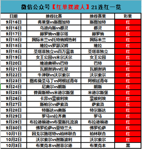 去年的这个时候创造的21连红的成绩在业界引发轰动,红单势头一时无两,也正是在那个时候,【红单摆渡人】的名号正式在业内打响。经过了时间的沉淀之后,摆渡人的红单势头丝毫没有减弱,长期稳定在80%以上的胜率更是让很多人望其项背,并且全部都是真实战绩,全部可以回查。