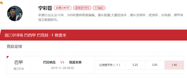 周三018场 巴西甲 巴竞技 -1 格雷米,推荐让球负